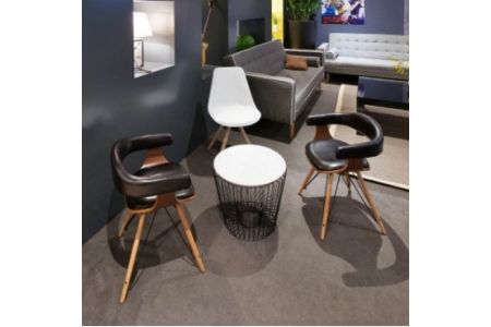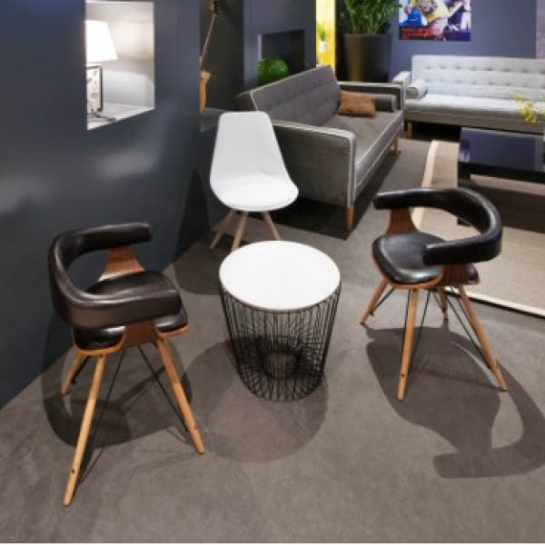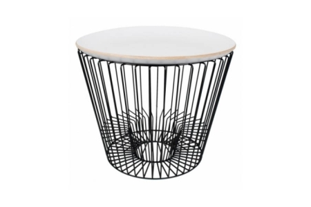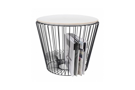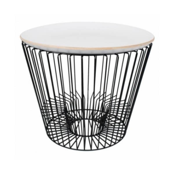 Son plateau blanc en bois, délicatement posé sur une structure fine en métal filaire, séduit par ses formes arrondies et son allure contemporaine.